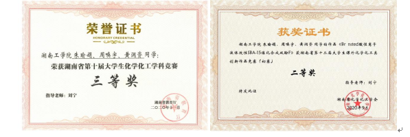 周唤宇同学积极参加各种化工学科竞赛,获得“湖南省第十二届大学生课外化学化工类创新作品竞赛二等奖”、“湖南省第十届大学生化学化工学科竞赛三等奖”,其相关研究成果获得“2020年湖南建材科技论文论坛一等优秀论文”。