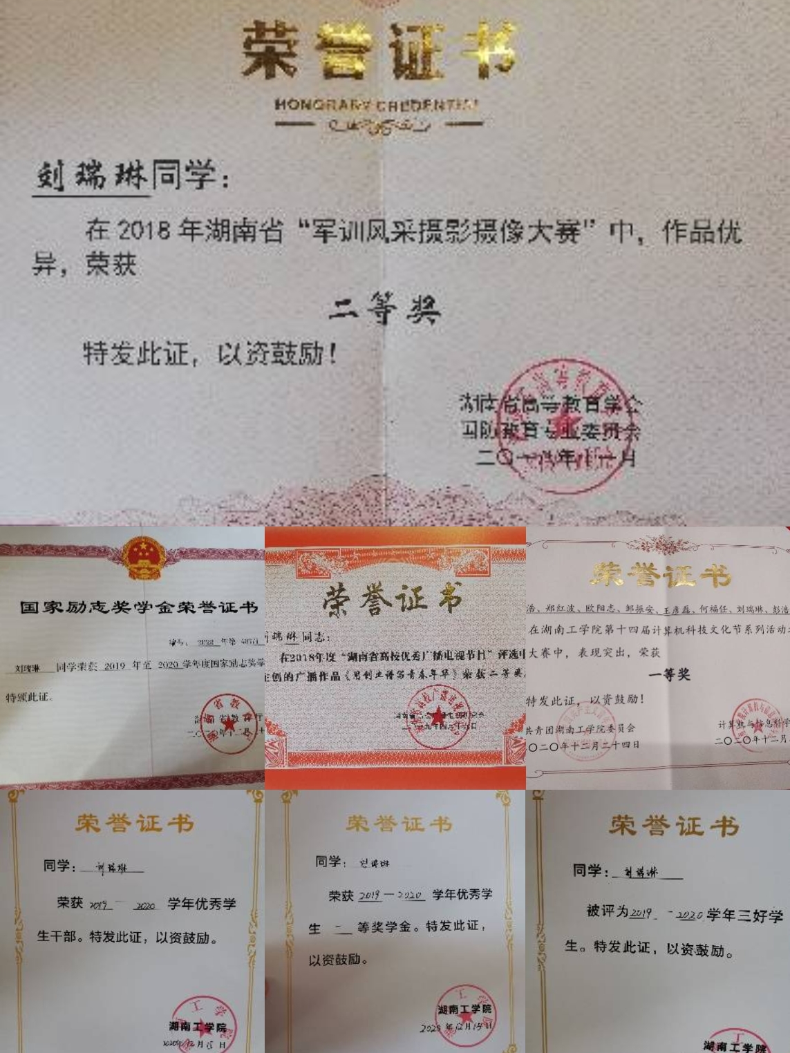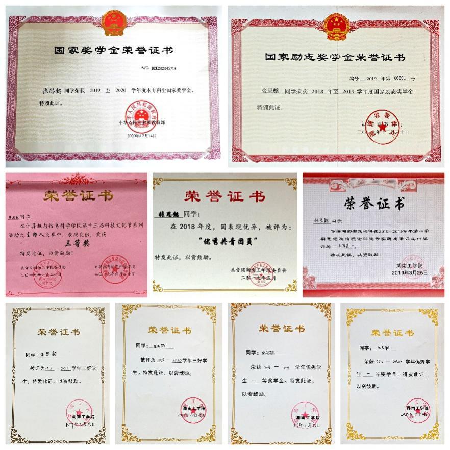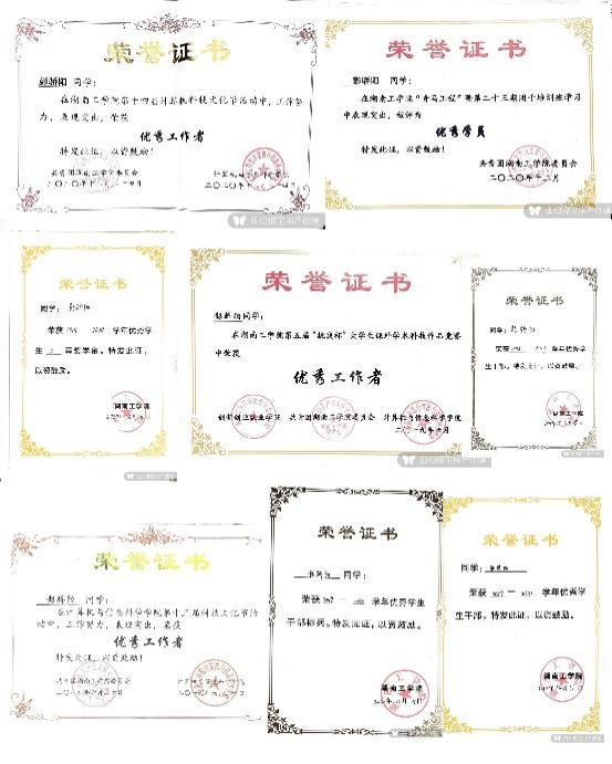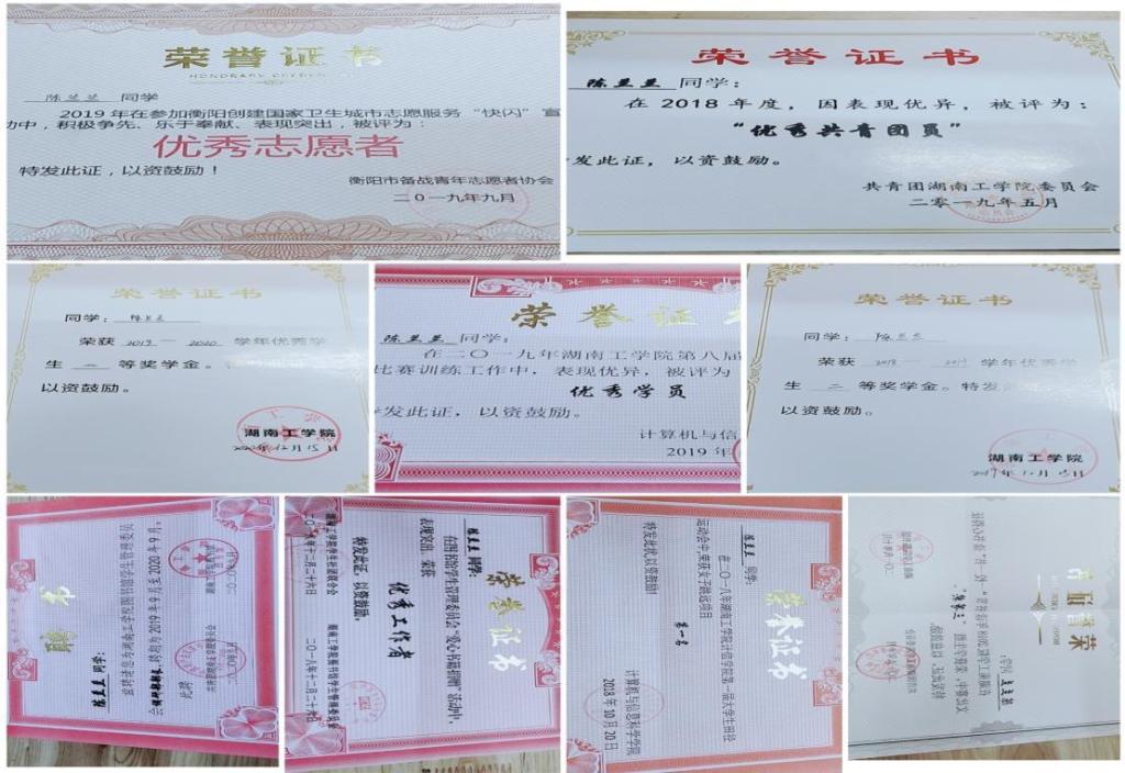 在校期间荣获国家励志奖学金3次、校级一等奖学金2次、校二等奖学金1次、校三好学生3次、校三好学生标兵1次、校优秀共青团员1次,校优秀学生干部1次;多次参加学校组织的公益活动,在衡阳市首届国际马拉松比赛中获“优秀志愿者”。