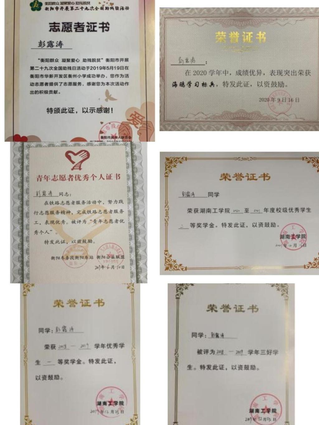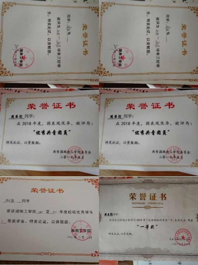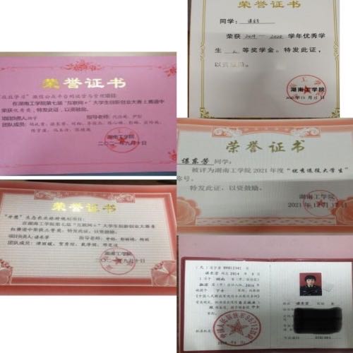 在校期间成绩优异,全面发展,获得国家励志奖学金3次、校级一等奖学金1次、校级二等奖学金2次、校级优秀学生干部标兵1次、校级优秀学生干部2次、校级三好学生1次、海鸥学习标兵1次、顺隆学习标兵2次、优秀五四共青团员1次、优秀五四共青团干1次。荣获湖南省第十四届挑战杯大学生课外学术科技作品竞赛三等奖1项,“创青春”大学生创业大赛“银奖”1项,“互联网+”大学生创新创业大赛“一等奖”2项、“三等奖”1项、“优胜奖”1项,“挑战杯”大学生课外学术科技作品竞赛“一等奖”1项、“二等奖”1项,大学生创新创业项目校级立项。此外,个人累积在校网以第一作者发表文章5篇,累积在外网以第一作者发表文章4篇。个人也多次参与志愿活动,荣获“优秀志愿工作者”。