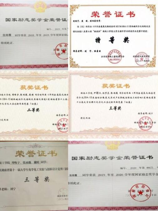 在校期间连续三年综合绩点位于专业前三,荣获国家励志奖学金三次、校级一等奖学金三次、校级三好学生两次、校级优秀班干部一次、湖南省十二届大学生课外化学化工类创新作品竞赛三等奖、湖南省第十三届大学生课外化学化工创新作品竞赛二等奖、湖南省第十一届大学生化学化工实验与创新设计竞赛三等奖。