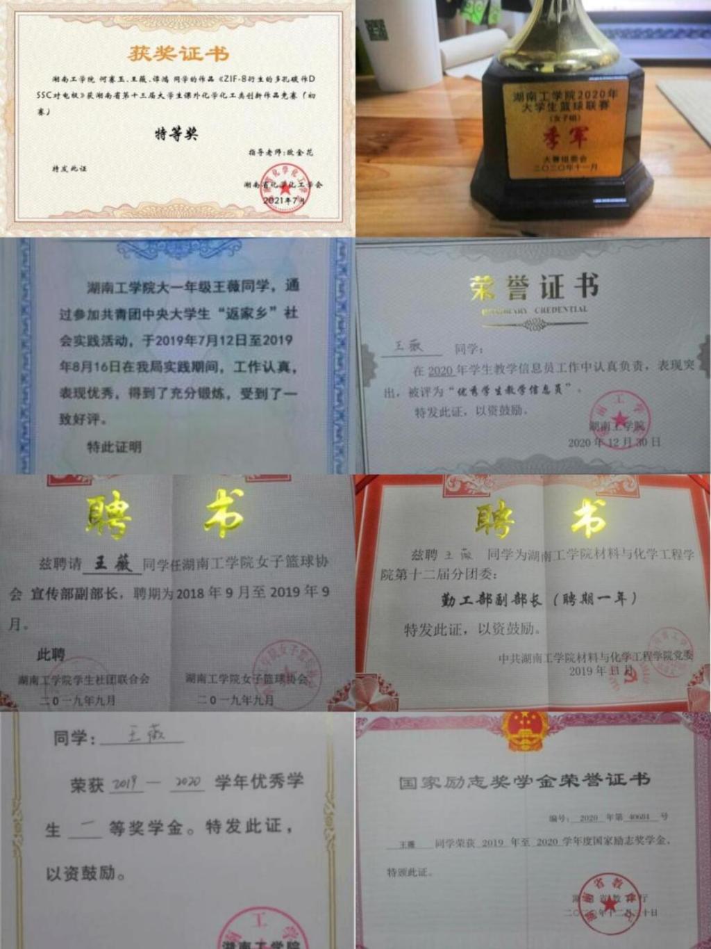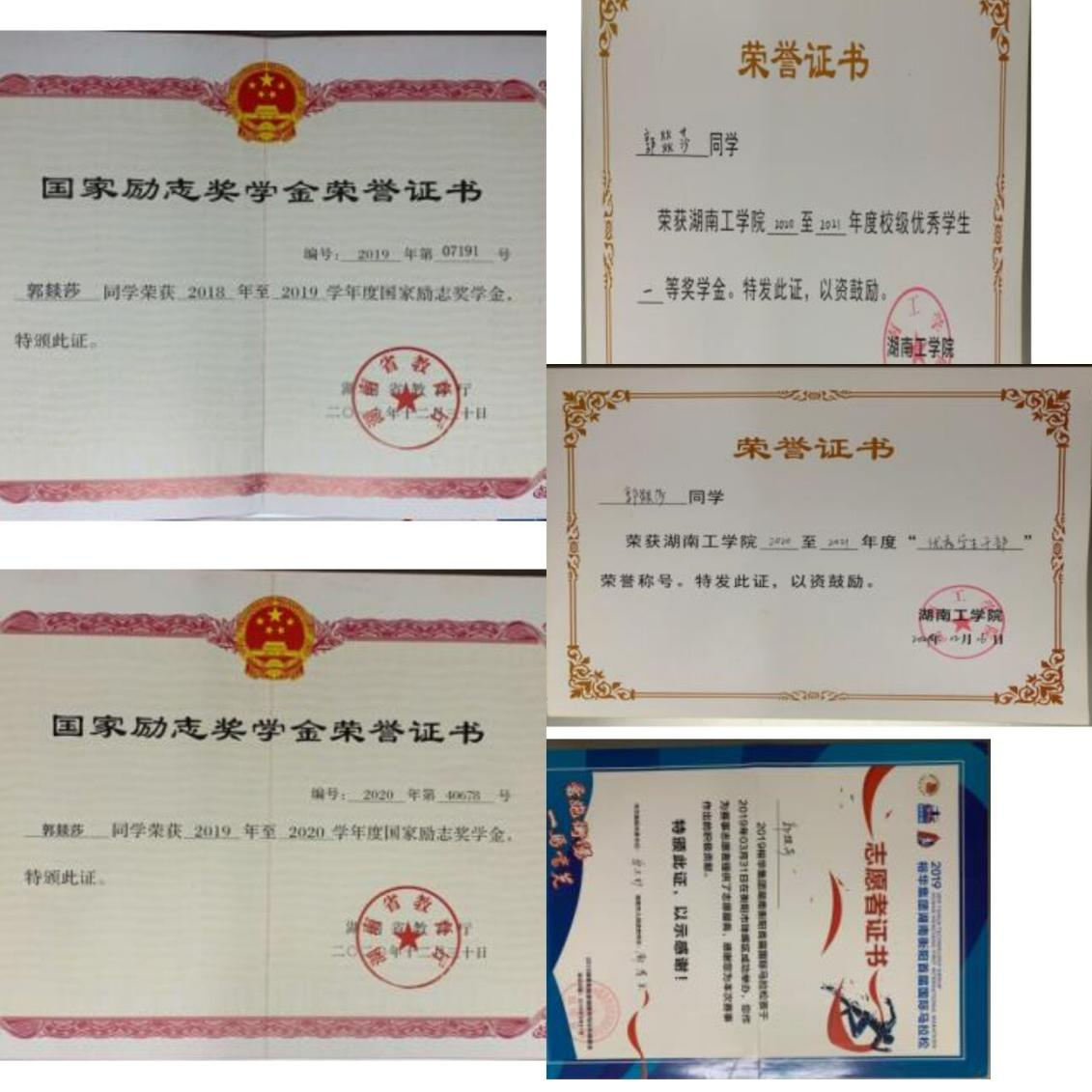 在校期间专业成绩前三,荣获国家励志奖学金3次,校一等奖学金3次,校三好奖学金1次,校优秀信息员2次,湖工杯女子组第三名2次、第一名两次,以第二、第三作者发表论文3篇,大学生返家乡社会实践优秀实践团队1次,湖南省化学化工创新竞赛特等奖1次,大学生国家立项成员,并结题。