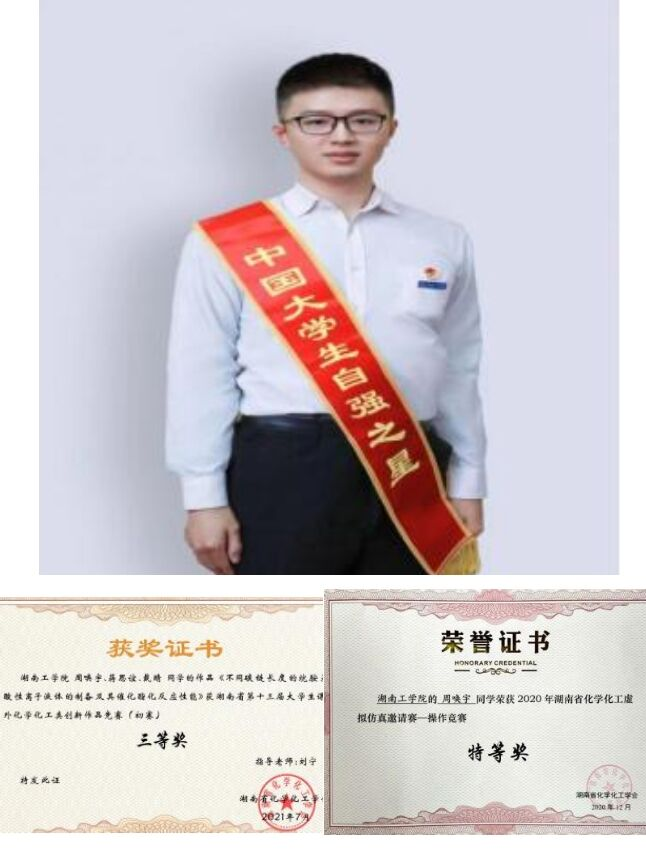 大学期间平均学分绩点4.25分,专业第一。以优异的成绩通过英语四六级、乒乓球国家二级裁判员资格证书等考试。荣获国家奖学金1项,湖南省化学化工虚拟仿真比赛特等奖3项,湖南省大学生课外化学化工类创新作品竞赛二等奖2项、三等奖3项,湖南省大学生化学化工学科竞赛三等奖2项等20余项省级及其以上荣誉;荣获“互联网+”大赛一等奖2项,“挑战杯”竞赛特等奖1项、校一等奖学金3项等20余项校级荣誉;创新创业项目获得省级立项;在《能源化工》等期刊发表论文3篇、在《best365中国官方网站校报》发表论文2篇。