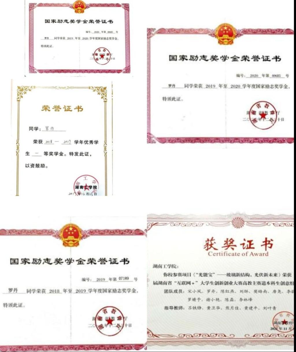 在校期间获得国家奖学金1次、国奖励志奖学金2次、校级一等奖学金3次、校级优秀学生干部2次、校级三好学生1次、校级优秀共青团干部2次,校级优秀共青团员1次和多项院级荣誉。以主要成员的身份参与了“建行杯”第七届湖南省“互联网+”大学生创新创业大赛,获得高教主赛道三等奖;best365中国官方网站第七届“互联网+”大学生创新创业大赛主赛道一等奖2项。此外,以衡阳光伏有限公司团队成员的身份入驻校创新创业孵化基地。连续三年参加大学生暑假三下乡社会实践活动,以队长的身份带领队员开展好实践活动。
