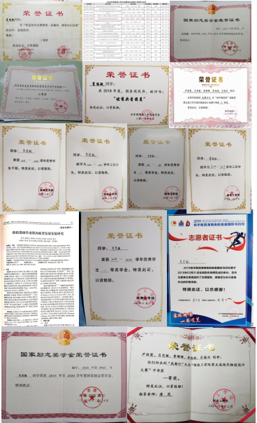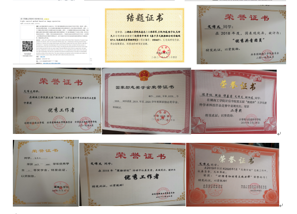 在校期间获国家励志奖学金、二等奖学金、三等奖学金、校优秀共青团员、优秀学生干部;2020年国家级大学生创新创业项目负责人;参与2019年国家级大学生创新创业项目;参与2018年湖南省教育厅优秀青年项目;获得实用新型专利1项;获得发明专利3项;第五、六届“挑战杯”大学生课外学术科技作品竞赛获得二等奖;参加“三下乡”大学生社会实践活动1次。优秀志愿者,优秀工作者若干。