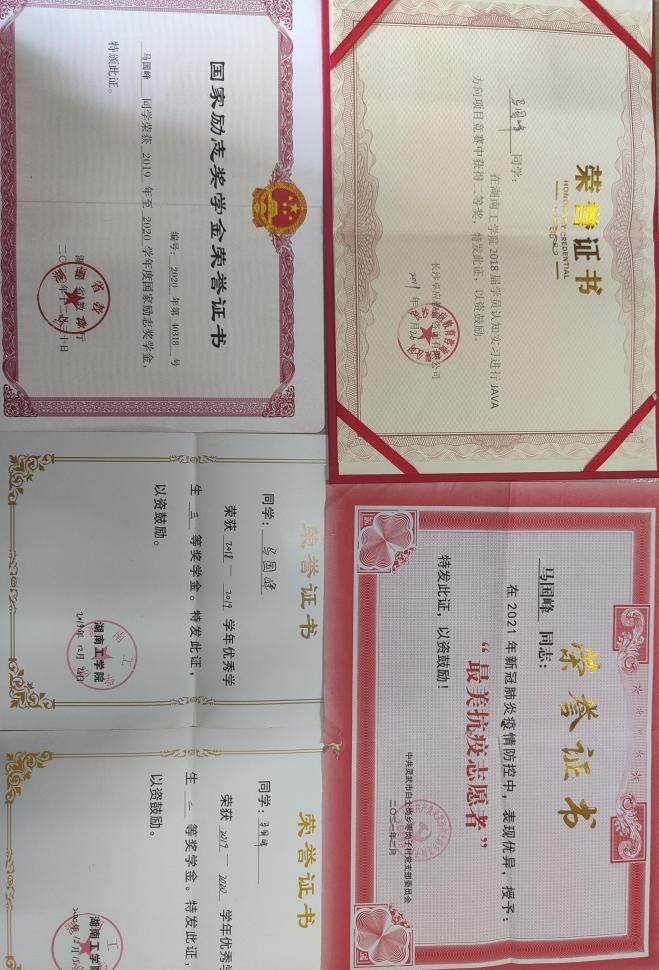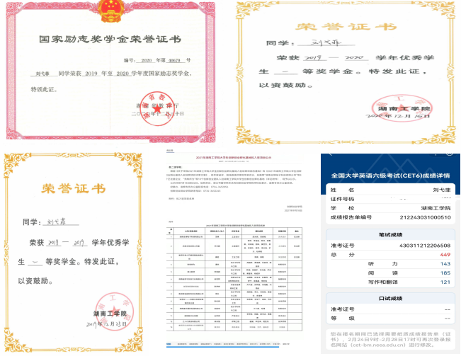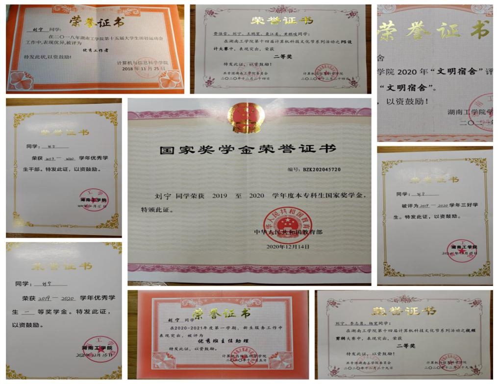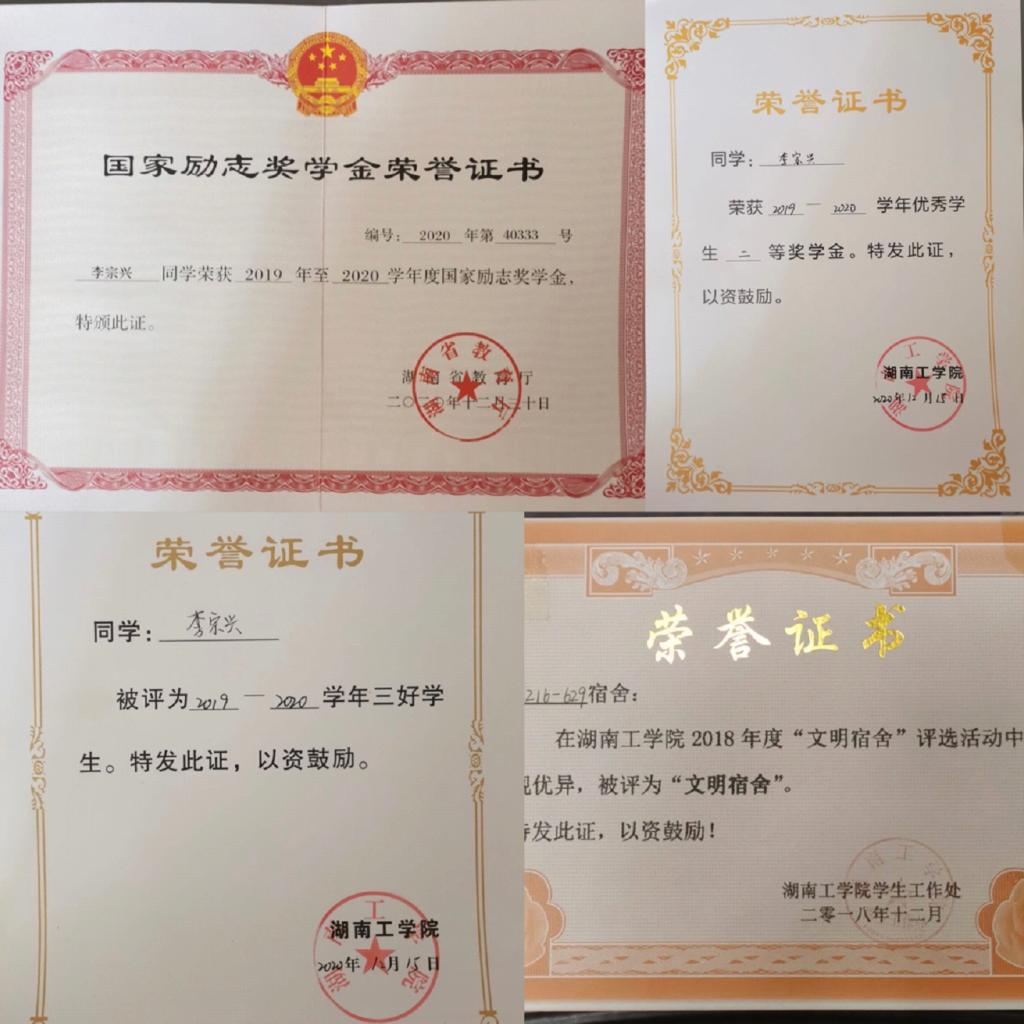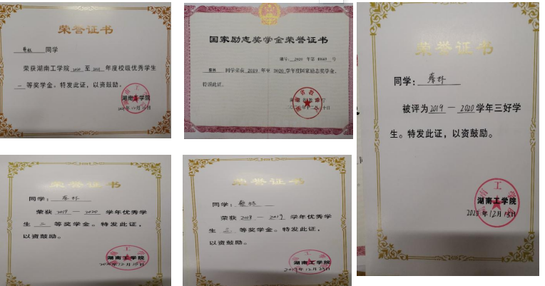 在校期间,获国家励志奖学金、校级一等奖学金、校级二等奖学金、校级三等奖学金、校三好学生、校优秀团员。