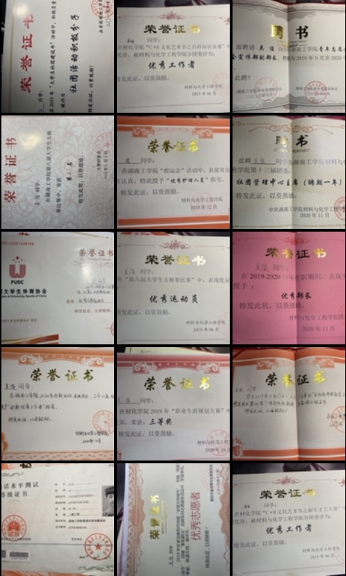 在校期间自大二上学期协助教师参与科研工作,总计拿过奖学金2次,校级三好学生1次,优秀信息记录员1次等;并在大学期间参加有太极拳、湖南百公里毅行等运动竞;力学、物理、数学等学科竞赛,取得一定成绩;且多次参加校内外“挑战杯”、“互联网+”等比赛,共计省级奖项3项,校级奖项3项,院级奖项若干。