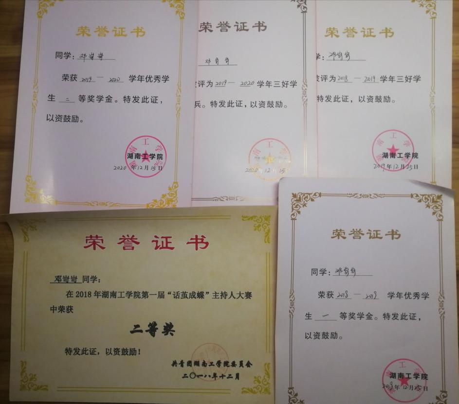 在校期间荣获国家励志奖学金2次、校级一等奖学金1次、校级二等奖学金1次、校三好学生1次、校优秀学生干部1次、校优秀团员干部1次、校优秀共青团员1次。