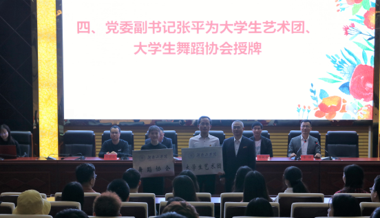 张平为大学生艺术团、大学生舞蹈协会授牌,蒋纯金为指导老师颁发聘书,余忠为团长、会长颁发聘书。