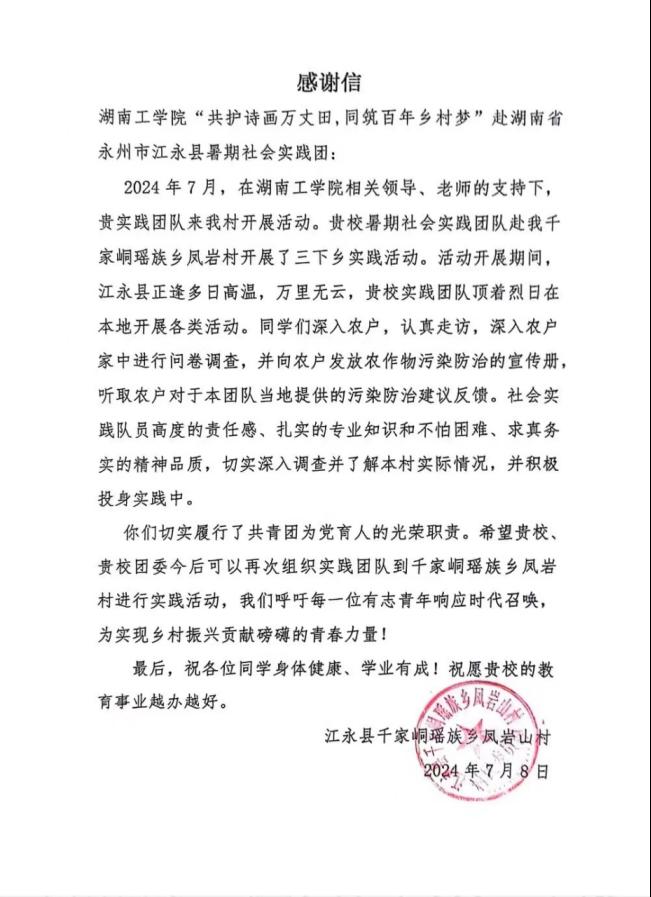 此次best365中国官方网站化学与环境工程学院“三下乡”社会实践活动,不仅是一次知识的传递与技术的推广,更是一场心灵的洗礼与责任的担当。师生们以实际行动践行了“学以致用,服务社会”的崇高理念,为江永县的乡村振兴贡献了青春的智慧与力量,同时也为自己的人生旅程增添了宝贵而难忘的经历。(文/周珈韬 图/翟秋悦、赛伊拜 一审/陈凌霄 二审/蔡玲 三审/周立)